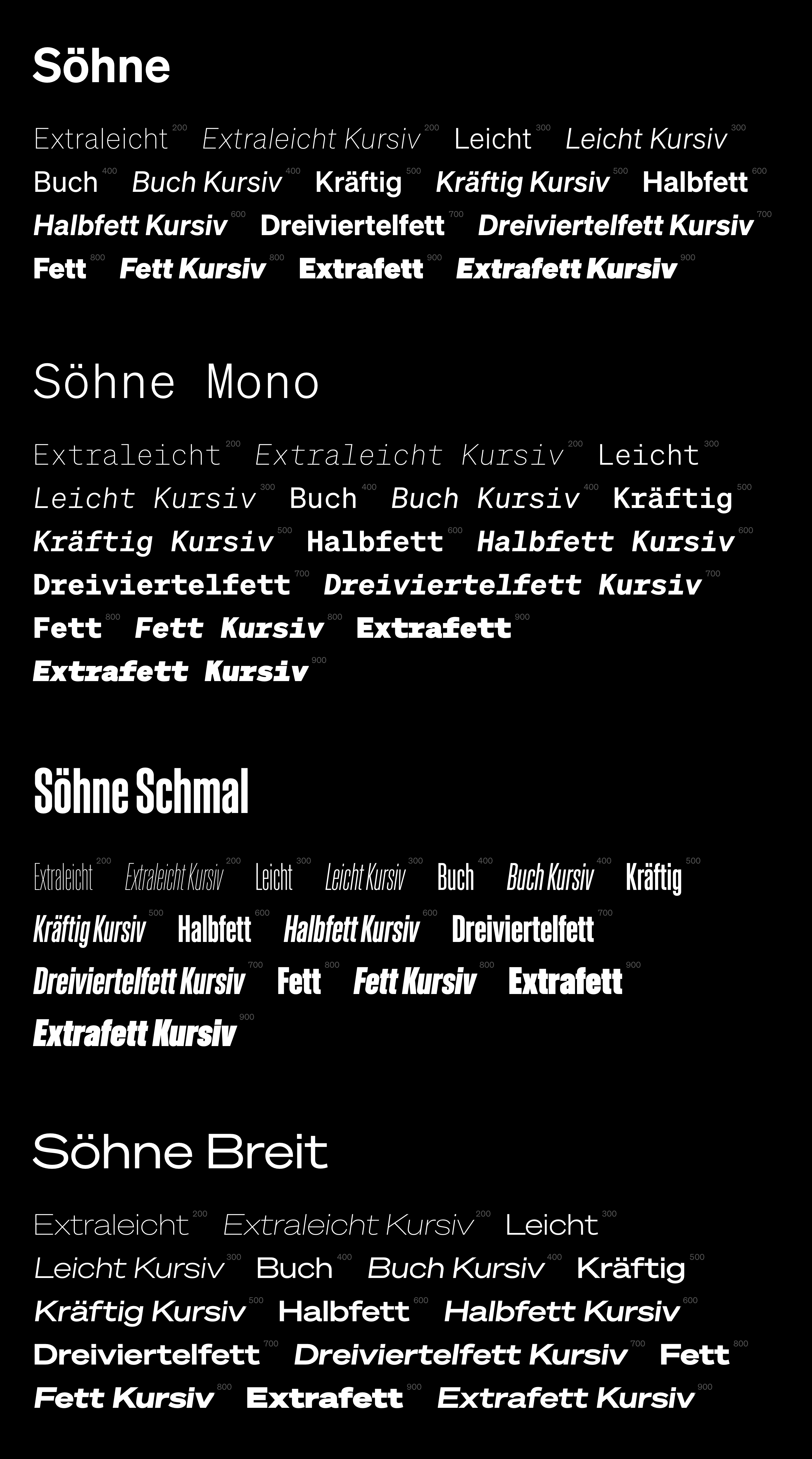 A font family is a set of fonts, almost always created by the same type designer, that are stylistically connected to one another, and designed to be used together. For example, we use two typefaces from the Söhne family on this site — Söhne (two weights: Buch and Halbfett) and Söhne Schmal (one weight: Fett).
