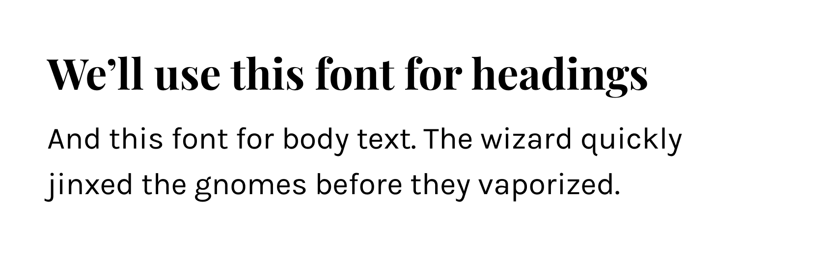 Finally, this combination of Playfair Display and Karla works well. Playfair Display is a didone serif intended for use at larger sizes, so is suitable for use in headings. Karla is a grotesk sans-serif with similar proportions and letter shapes to Playfair Display. The two fonts harmonise well, while having enough points of contrast to be interesting.