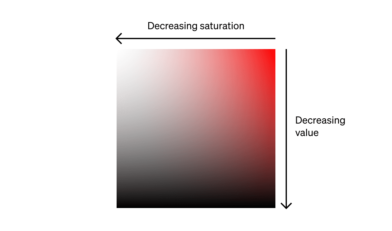 Remember, in most design tools, if you move the colour picker to the left, you are reducing saturation (“adding” white), and if you move the colour picker down, you are reducing value (“adding” black).