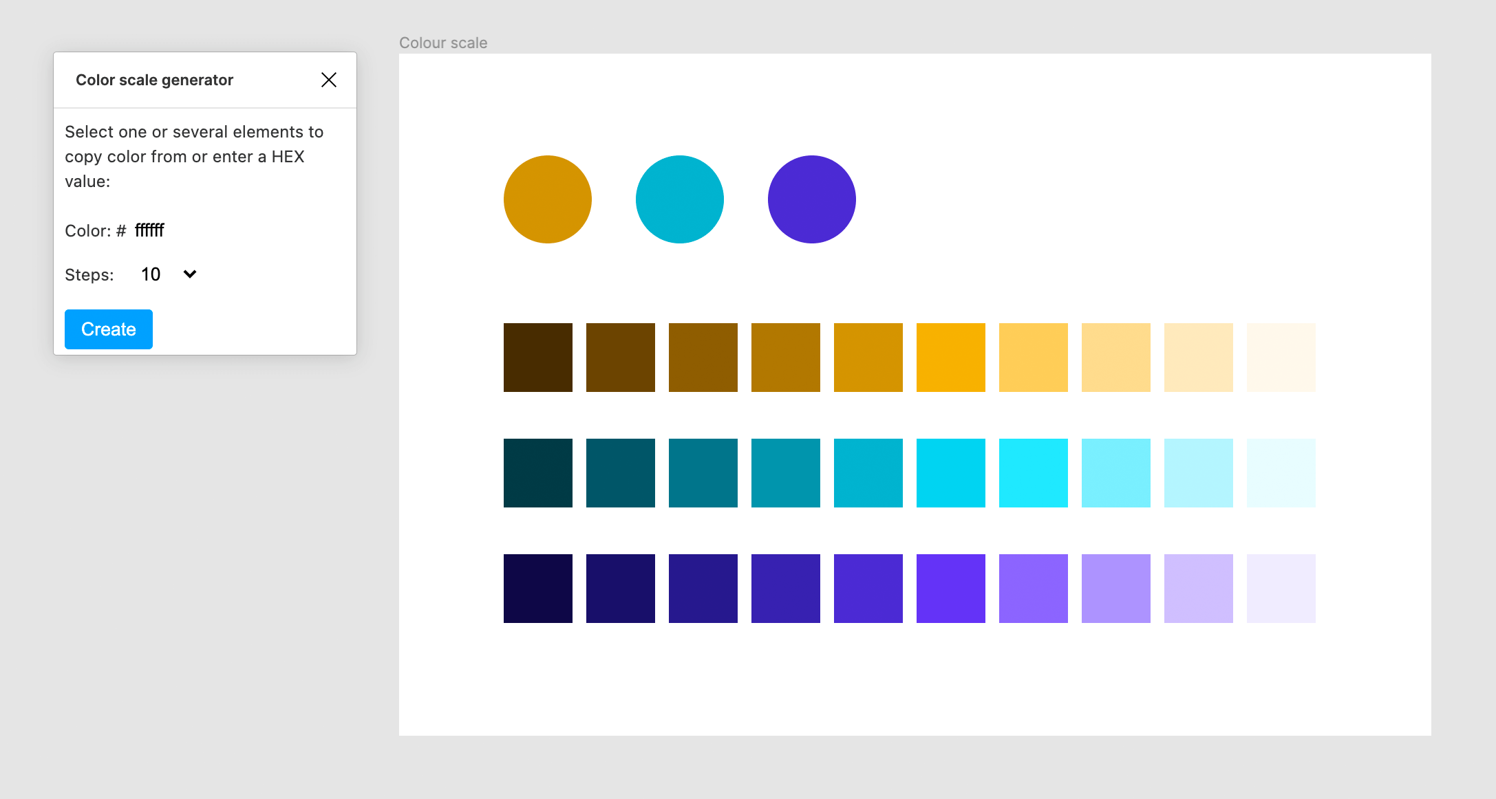 To use it, all you need to do is install it, then select the “Plugins” menu in Figma, and click “Color scale generator”. Then just create some shapes filled with your colours, select them, and click “Create”. Hey presto!