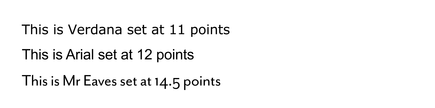 Conversely, fonts with a smaller x-height need to be set to a larger point size. For example, for Mr Eaves to look like 12pt Arial, it needs to be set to 14.5pt.