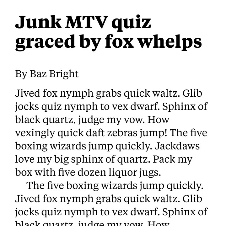 An excellent example of a serif font with a tall x-height is Tiempos, which you can see below. Note how close the x-height is to the cap height. This means that the text will appear to be much bigger than its point size, and will remain legible at small sizes.