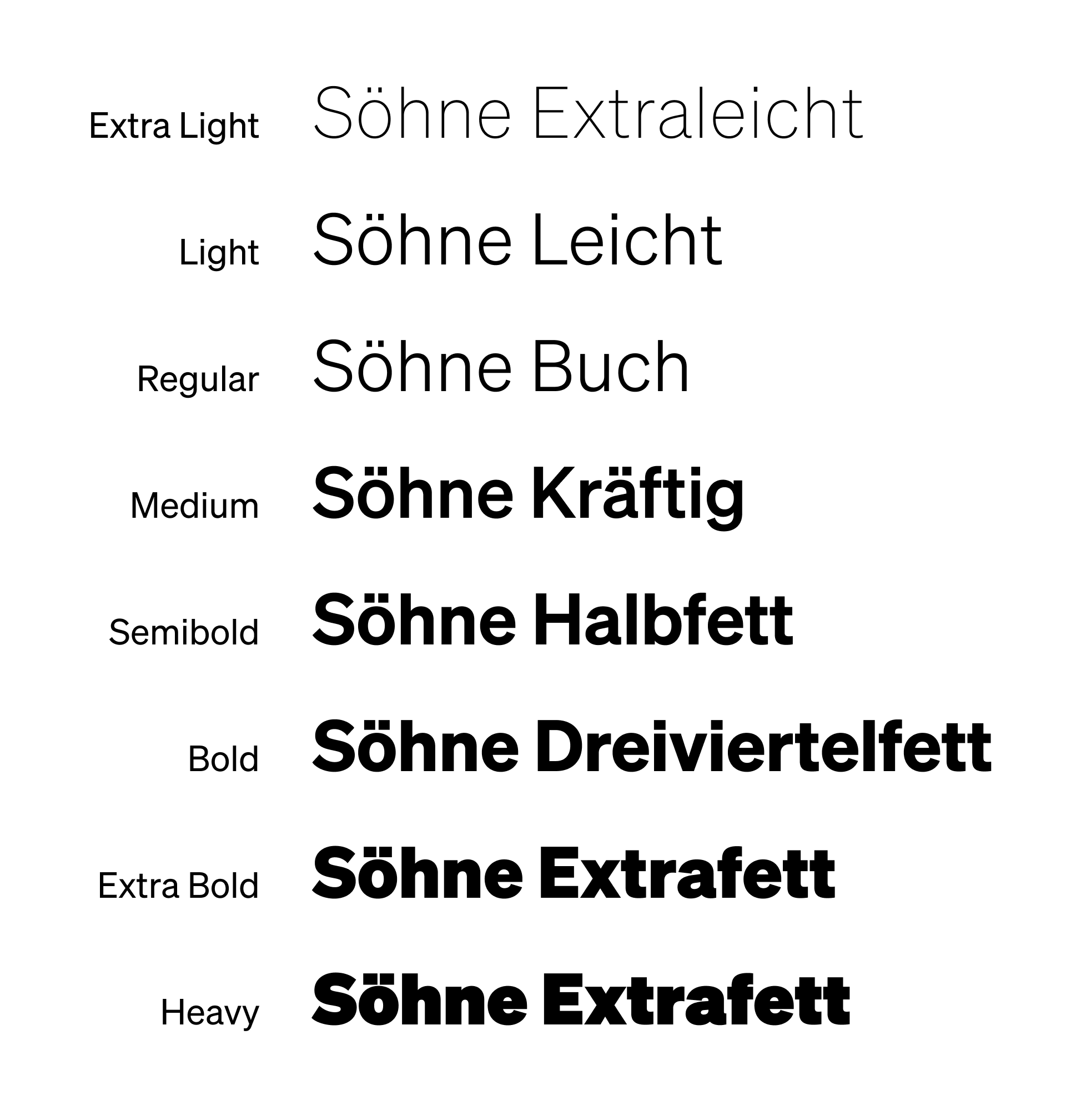 The exact weights available, and how they’re named, vary from typeface to typeface. For example, Söhne, one of the fonts we use on this site, has eight weights: